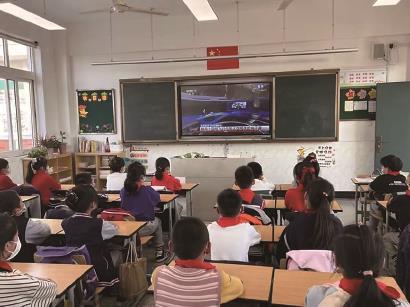 课堂上,在各班教师的带领下,学生们端坐于桌前共同收看《天宫课堂》,观摩区主题队日活动。
