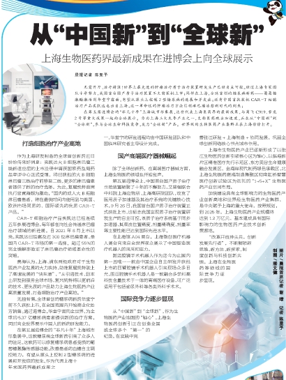 在第五届进博会的“非凡十年”上海城市形象展,这些代表上海医药界的最新成果,与商飞C919、雪龙2号等重大成果一起向全球展示。作为上海三大先导产业之一,生物医药跑出加速度,正在从“中国新”到“全球新”,参与全球生命科技竞争,发力“全球新”产品。世界级的生物医药产业集群正在上海徐徐打开。