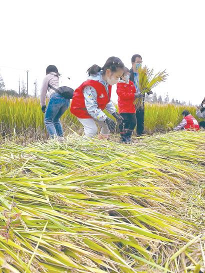 令我印象最深刻并且最喜欢的,是割稻比赛。在农民伯伯进行示范后,我就一头钻进了稻田里。蹲下身,弯下腰,一手紧握镰刀,一手抓一把稻秆,忙活起来。一开始用力不当,觉得很难,后来在农民伯伯的指导下,我好像掌握了一点技巧,成功收割了第一把稻谷。那一刻,别提有多开心了。之后就越来越熟练了,我身后的稻谷渐渐堆成了小山。