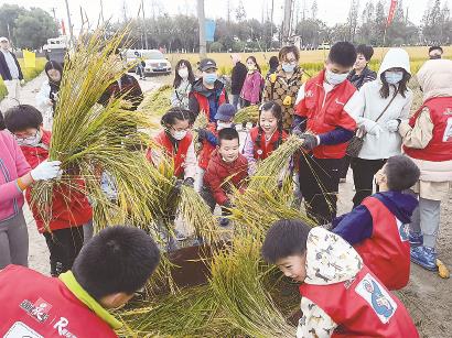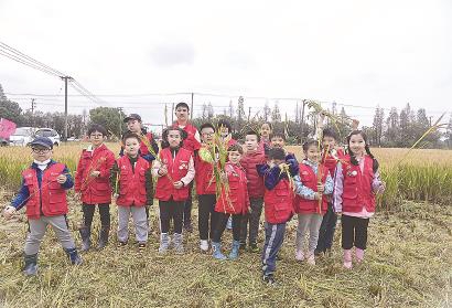 在青浦区一片金黄色的稻田里,身着红马夹的小记者们就这样热热闹闹地忙碌着。我们正在体验收割稻谷,了解农民们秋天的工作。