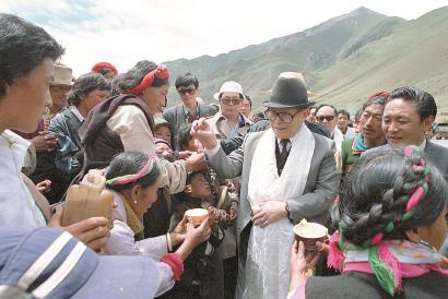 1990年7月25日,江泽民同志与藏族群众共庆望果节。 本版图片/新华社