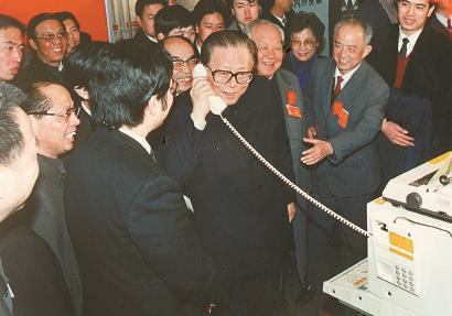 1984年5月,江泽民同志在北京展览馆举行的全国电子新产品展览会上,试用国际长途电话向远方的工作人员问候。