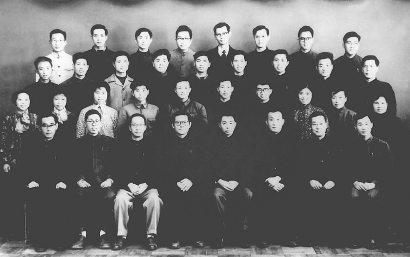1963年3月,江泽民同志(前排右五)在上海同小型三相异步电机全国统一系列设计领导小组成员合影。