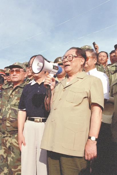 1998年8月13日至14日,江泽民同志亲赴湖北长江抗洪抢险第一线,看望、慰问、鼓励奋战在抗洪抢险第一线的广大军民,指导抗洪抢险斗争。这是8月13日江泽民同志在洪湖市乌林镇中沙角险段大堤上,向正在抗洪抢险的军民发表讲话。