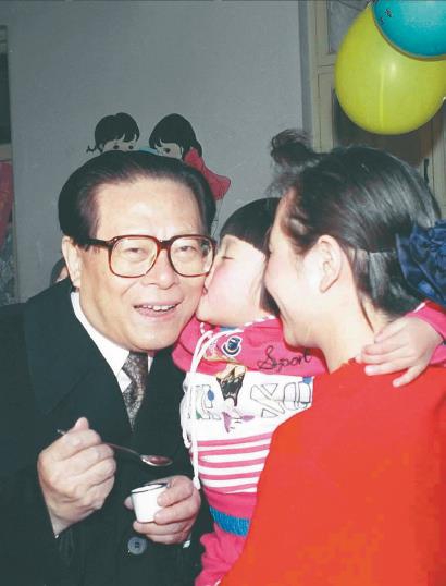 1993年12月5日,江泽民同志在北京为一位幼儿园儿童喂服脊髓灰质炎疫苗后,小朋友亲吻江爷爷。