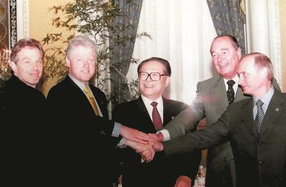 2000年9月7日,由中国倡议的联合国安理会五个常任理事国首脑会议在纽约举行。江泽民同志(中)同法国总统希拉克(右二)、俄罗斯总统普京(右一)、英国首相布莱尔(左一)、美国总统克林顿(左二)握手合影。