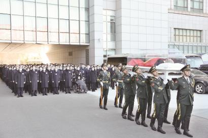 10时20分,8名礼兵荷灵,伴着哀乐缓缓走出告别室。习近平等护送江泽民同志的遗体上灵车。