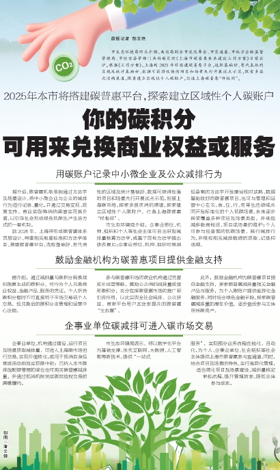 市生态环境局昨天介绍,由该局联合市发改革会、市交通委、市地方金融监督管理局、市经信委等部门共同制定的《上海市碳普惠体系建设工作方案》日前出炉。根据《工作方案》,上海到2025年将搭建碳普惠平台,选取基础好、有代表性的区域及统计基础好、数据可获得性强的项目和场景先行开展试点示范,探索多层次消纳渠道,探索建立区域性个人碳账户,打造上海碳普惠“样板间”。