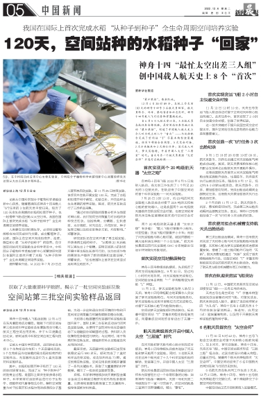 记者从中国科学院分子植物科学卓越创新中心获悉,随着圆满完成神舟十四号载人飞行任务的3位航天员平安归来,经历了120天全生命周期的水稻和拟南芥种子,也一起搭乘飞船返回舱从太空归来。我国在国际上首次完成水稻“从种子到种子”全生命周期空间培养实验。