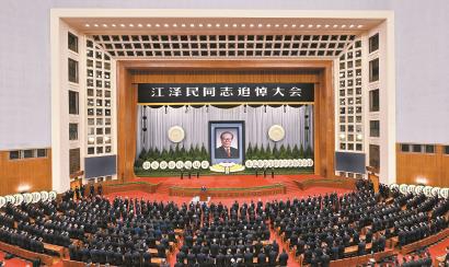习近平致悼词 李克强栗战书汪洋李强赵乐际王沪宁韩正丁薛祥李希王岐山参加追悼大会 蔡奇主持大会 会场横幅上写着:“在以习近平同志为核心的党中央领导下,继承江泽民同志的遗志,把新时代中国特色社会主义伟大事业推向前进!”