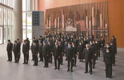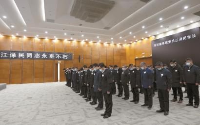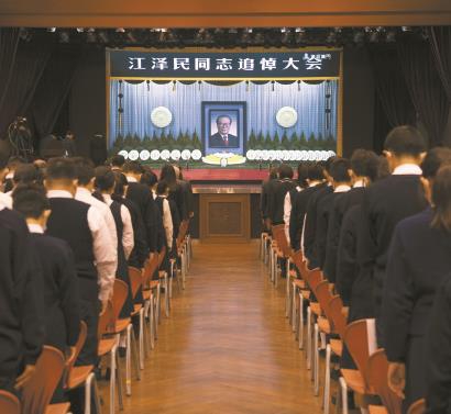 12月6日上午,中共中央、全国人大常委会、国务院、全国政协、中央军委在北京人民大会堂隆重举行江泽民同志追悼大会。举国上下,各族人民沉痛悼念江泽民同志。这是在上海交通大学,师生代表肃立默哀。 /本版图片 新华社