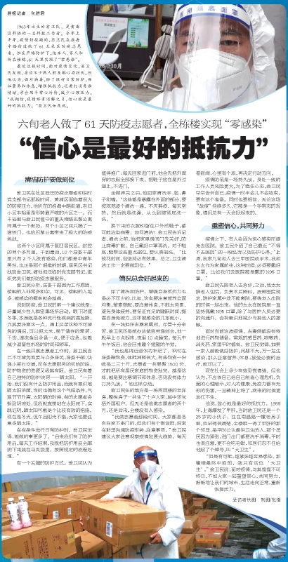 “我做志愿者那段时间,大家都是各自在家不串门的。但我们有个微信群,经常在群里沟通防疫形势、注意事项。”翁卫民建议大家注意观察疫情发展大趋势,每天看新闻,心里有个底,再决定行动方向。