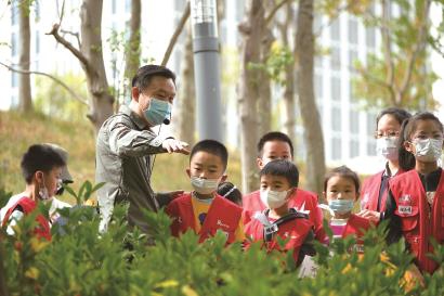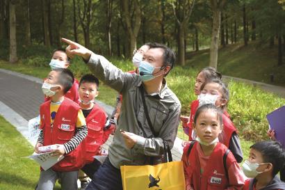 秋日的一天,桃浦中央绿地公园里,我们晨报学记团的小记者们,正在生姜老师的带领下进行自然探索。