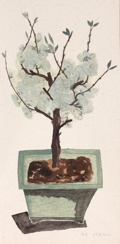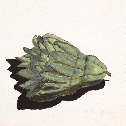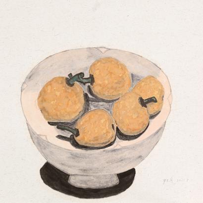 阿籽奶奶的画常常是一个静物,安静地占据画面中央。那些占满半开乃至全开画纸的大画幅画作,原型是不过手掌大小的铜钱草、拳头大小的橙子、鹌鹑蛋大小的茶叶包。奶奶说:“好像穷日子过惯了,画纸的每个空间都要利用上,表达心中的热爱。”