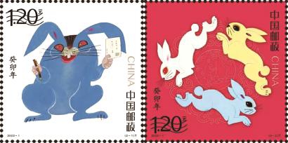 据介绍,作为中国生肖邮票第四轮中的第八套,该套邮票传承了传统文化又融入了创新精神。邮票第一枚“癸卯寄福”,用蓝色描绘了一只右手执笔、左手持信的卯兔,将生肖与书信文化结合,寄予了新的一年携手共绘宏伟“蓝图”的美好寓意。第二枚“同圆共生”,描绘了三只兔子首尾相接、奔腾不息的场景,表达出生生不息、团圆美满的吉祥寓意;背景衬以“玉兔捣药”纹饰,传递了祈求国泰民安、身体安康的诚挚祈愿。
