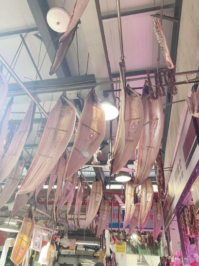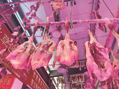 头顶上方挂着成排的香肠、鳗鲞、腊肉、腊鸭……当新闻晨报·周到记者看到这一派红火的景象,这才放下心,号称上海“最有年味”的东江阴街菜场还在。