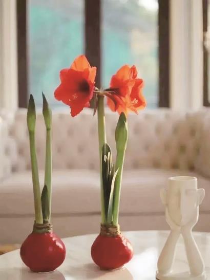 传统的朱顶红是土培的,现在有包裹鲜亮红色外衣的蜡封朱顶红,不用浇水,自行开花,有了它,一定有“好事花生”。