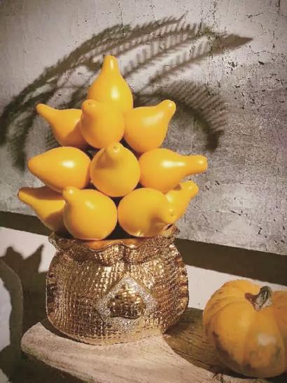 乳茄也是热门的年宵观果植物,外表金黄,果色鲜艳,呈现出一种收获的喜悦,又名“黄金果”“五代同堂”,寓意黄金万两、财运高照、百子多福、人丁兴旺。