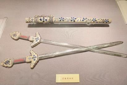 本次展览的一件重头展品是梅兰芳扮演虞姬时使用过的双剑。双剑是梅兰芳送给弟子王熙春的拜师回礼,后由王熙春之妹王熙苹捐赠给梅兰芳纪念馆。