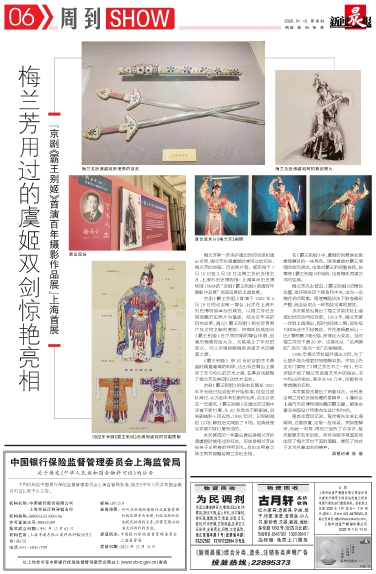 梅兰芳第一次来沪演出时的戏单和演出合同、梅兰芳扮演虞姬时使用过的双剑、梅兰芳的戏服、历史照片等,都现身于1月10日至2月26日由梅兰芳纪念馆主办、上海市历史博物馆(上海革命历史博物馆)协办的“京剧《霸王别姬》首演百年摄影作品展”全国巡展的上海首展。