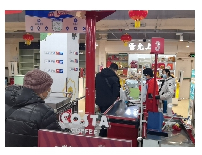 收银台前,数辆摆放得满满的推车等待结账,排在后面的顾客不时伸长脖子:“怎么还没好?”有其他排队者主动回答:“等一等,前面用卡的,在一件一件退!”