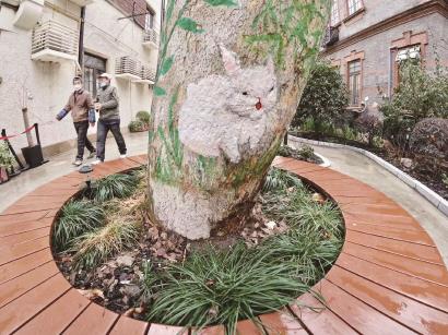 小小花园里,有休息椅,也有文化墙,贴心配备的小路灯点亮夜色,为晚归的行人照明。梧桐树上,“猫头鹰”“小猫咪”“小松鼠”等彩绘形象憨态可掬,有老人牵着孩童绕树嬉戏。