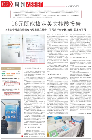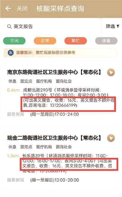 需要英文核酸报告的市民,可以提前通过随申办APP查询附近有哪些点位可以出英文报告,同时也可咨询具体收费情况。