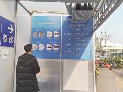 小张按照现场贴的“核酸检测流程”,扫码关注医院公众号,进入“互联网医院”,选择“核酸检测快速通道”,完成申请缴费后,前往窗口展码完成了采样。“我明天再带着护照过来取报告。”