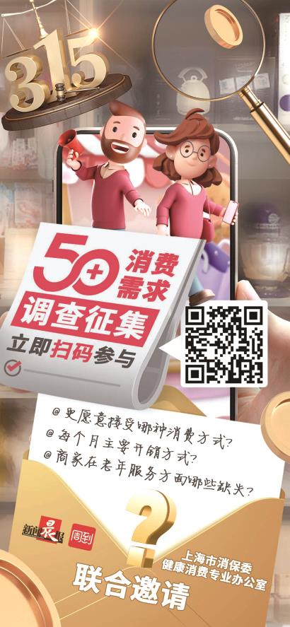 50+人群的消费问卷调查截止时间进入倒计时,对于上海阿姨爷叔们消费时的主要困难、老年人消费时期待的为老服务、涉老服务中关心和需要的方面……这些种种问题,你有什么想建议的?欢迎填写问卷,一起提升老年群体消费的友好度。