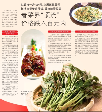 春菜界顶流——香椿终于跌进了一斤百元以内。昨天,一家买菜平台上,100克红香椿售价为19.8元,折算一斤99元,而上周,这种被称为“树上蔬菜”的春菜价格还在一斤100元以上,买一斤香椿可以买6斤猪腿肉。江杨北路批发市场里,3.5斤一把的批发价格也要320元。