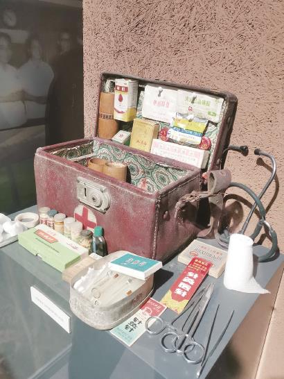 这只陈旧的棕红色药箱,箱体正面中间印有圆形白衬底的红十字图案,非常醒目。药箱旁摆放着常用的医疗用品,有听诊器、注射器、体温计、止血钳等;还有当年赤脚医生最常备的药品,灭菌结晶磺胺、牛黄解毒片、阿司匹林、绿药膏、麝香风湿油、护创膏、碘酊等。