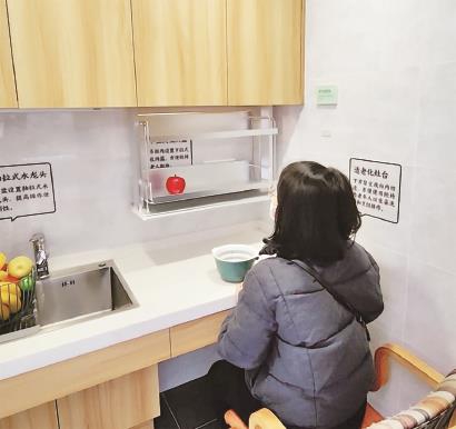 预防跌倒是适老化改造的一大重点。据中国疾病监测系统测算,我国每年有4000多万老年人至少发生1次跌倒,其中约一半发生在家中。站在凳子上、爬上梯子取物,就是极容易摔倒的做法,那么,有什么办法能安全地拿到高柜的东西呢?新闻晨报·周到记者逛了几处适老化改造的样板间,得到的答案是——升降拉篮。
