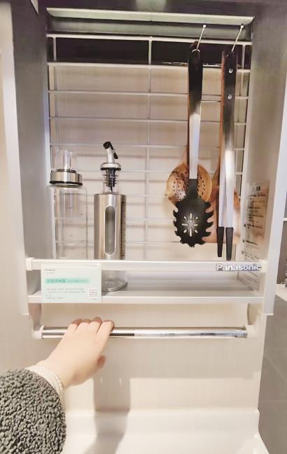 在松下住空间的厨房展间,记者还看到了一种比较特别的升降拉篮——对于深度比较深的高柜,还可以做成薄柜+背抽式拉篮。
