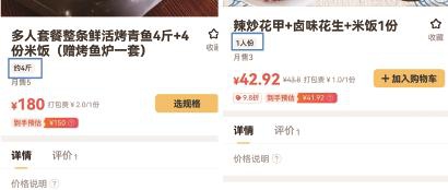 还有名为“烤鱼大咖小龙虾”的店铺,对多人套餐标注为“整条鲜活烤青鱼4斤+4份米饭”。不过,该店铺也有少数菜品,比如“辣炒花甲+卤味花生+米饭1份”就没有标注重量。