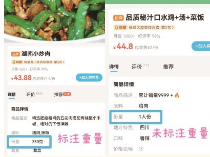 “时标时不标”的情况也出现在其他一些店铺中。比如,王记私房湘菜的湖南小炒肉标注为350克,但像香辣牛蛙2人餐这样的套餐就未标注;河间驴肉火烧·疙瘩汤对“精品卤香驴肉”“疙瘩汤+两个传统驴肉火烧”有重量标注,但“鸡蛋汤+两个传统驴肉火烧”没有。