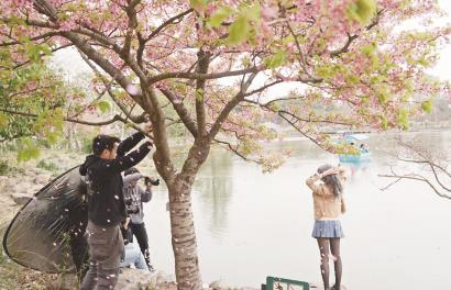 在一些公园,记者也的确看到,有的小姐姐带着四五个人的团队,有的打光,有的拍照,有的化妆,爬上公园樱花树下的石头,嘴里叼着一朵樱花,被“伺候”着拍了许久。