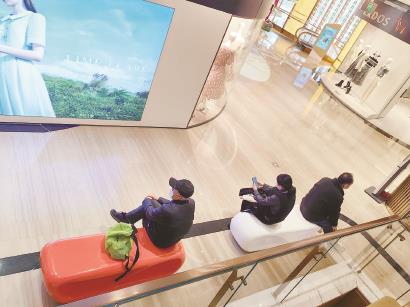 在百联南方商城、淮海百盛、新世界城三家商场,记者都看到在商场的走廊、电梯厅等区域,都有坐感比较舒适的座椅。