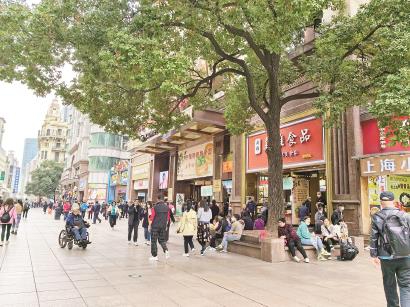 当记者走在南京路步行街,可以看到不少人坐在路边的座椅上休息。