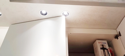 至于天花板上掏出来的豁口,程先生说,本来都是空调出风口,他们做的不配套,强塞进去,外面的边沿线都是弯曲的,很难看。“他们的设计很有问题,你看壁柜边上这些顶灯和空调出风口,以前边沿露在外面,竟然挡住了柜子门。是他们自己设计的,柜子门都开不了!匪夷所思吧?当然,这些灯后来他们重新换了,空调出风口还在等待安装。”