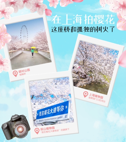 在上海,樱花正盛开,几处网红拍照点绝对需要选对时间、避开人流拍摄。 顾村公园的网红拍照点是樱舞桥,站在这里能拍到樱花与摩天轮同框的美景,半小时里有百余人在桥上拍照。有游客说,“摩天轮很浪漫的,而且被刷成了粉色,樱花也是粉粉的,所以很搭。” 上海植物园的网红拍照点是河边一棵樱花树。它位于盆景园门口的河边,虽然只有一棵,但它已有很多个年头,花开得特别繁盛,树姿倾斜,显得很特别。 辰山植物园的网红拍照点一处位于“我在樱花大道等你”的路牌下,另一处是综合楼二楼平台。河津樱开放的时候,路牌前每分钟要同时“接待”N个人拍照。 图/李勇 上海植物园 辰山植物园