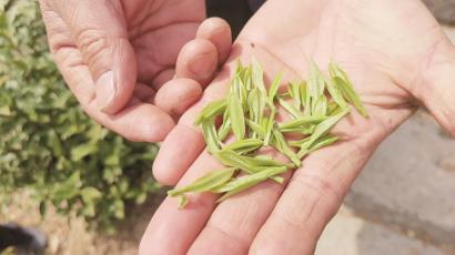 一大早就开车前来安吉的两位“老克勒”周爷叔和曹爷叔都是爱茶人,成了首波造访茶园的上海客人。看了看今年茶叶长势,很是令人振奋,“现在这个季节出的是一芽一叶的明前茶,有的芽头已经很饱满,可以采摘,有的还要再等两天,让它再长长。”曹爷叔十分懂行。