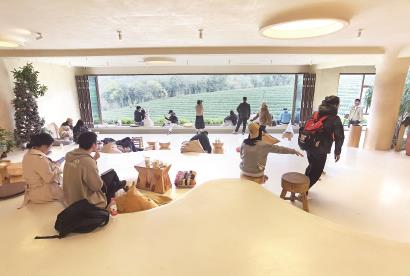 在朋友圈里,安吉“一片叶子”观景平台俨然成了“网红”热门打卡地,一墙直面茶田且可以开启的巨幅落地窗,背后是沙发座椅错落的休闲空间,配以可购茶、咖啡等饮品的吧台,在这里,是“白茶融万物”。