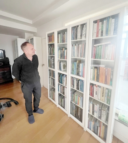 他坐在家中一张中式圈椅里,他的家位于嘉定区江桥镇,这套复式公寓带5个阳台。除了随处可见的猫窝,他还在密封的阳台上为自己收养的多只流浪猫用捡来的树枝搭建起猫爬架。