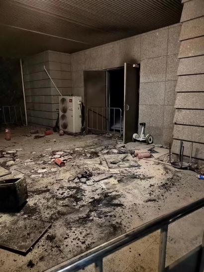 消防车泡沫管接到消控室门口,此时现场火情已被物业人员使用干粉灭火器扑灭,消防车泡沫灭火系统并未实际喷射。消防队员采用专业工具将室内漂浮的浓烟与干粉全部吸附并确认没有阴燃火情后于21:50分离开现场。