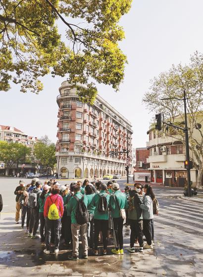“武康大楼原名诺曼底大楼,其外形犹如一艘等待启航的巨轮,俯视着上海稀有的六岔路口。”陈菁一边给跑团伙伴们讲解武康大楼的历史,一边带着团队来到武康大楼不远处、建于1920年的宋庆龄故居,这里是跑友们徒步打卡的第二站。