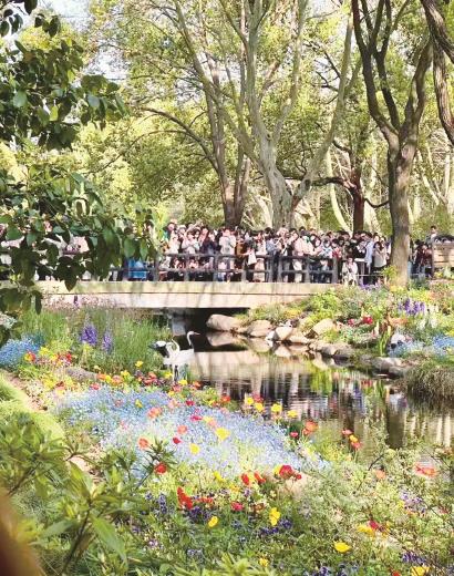 因为遭踩踏而在网络出名的花海现在已经不是共青森林公园人气最旺的景点了,现在公园“人口密度”最高的景点是“梦浣花溪”。为了拍摄这个景点,一座10米不到的小桥上,周末可以站满人,要抢到一个机位绝对要眼明手快脚快。