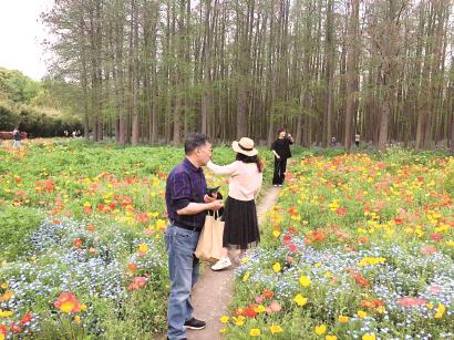 一名蹲在花海中的小径上,正用手机拍摄花海美景的游客表示,她以前觉得拍花一定要人进入花海里拍才好看,但现在觉得,其实在花海边,选好角度拍也能拍出很美的照片。