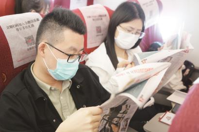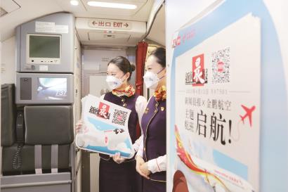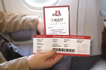 为了迎接这个特别的日子,金鹏航空提前两周就开始了活动策划和物料准备工作。12日一大早,300份新鲜出炉的新闻晨报带着油墨香气被送上客舱,这份报纸也正是工作人员戴着手套,将报纸每一张仔细折叠装进印有新闻晨报字样的信封中,并随信封附上了新闻晨报订阅卡、一张印有新闻晨报和金鹏航空logo的主题航班纪念登机牌,在飞行中发放给旅客。此外,在飞机客舱的主壁板上也张贴了主题航班的海报:生动的动漫飞机、美丽的空乘剪影迎接乘客登机。