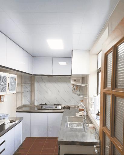 原来,厨房白色吊顶、墙面上铺贴的暖白色碳纤维快装墙板,对于整个氛围的营造作用不小。就记者的采访经历,对于这一材料很多沪上老人并不熟悉,而此前在日本生活过一段时间的王阿姨却告诉记者“很眼熟”,“以前我住日本的时候,酒店、宾馆用的都是这种板材,有些人家也会用。”