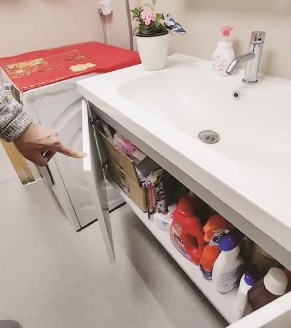 何叔叔家中一些物品的摆放都是遵循着就近收纳的原则。所谓就近收纳,说明白点,就是在哪里使用就收在哪里。何叔叔说,他们家囤的所有洗衣液、拖把清洗剂等都放在浴室柜下面。
